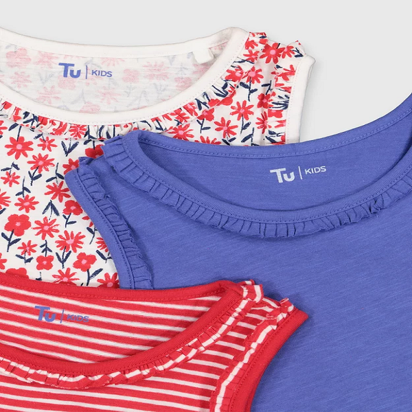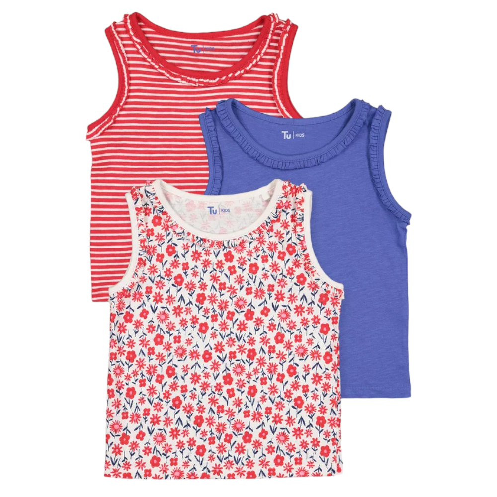 | Product Details A colourful mix of three vest tops in red and blue. With a printed floral design, a red and white striped and a plain blue colourway. Made from pure cotton with ruffles to the shoulders. Mix and match with shorts from the full collection (style no: 138182054). Online exclusive |